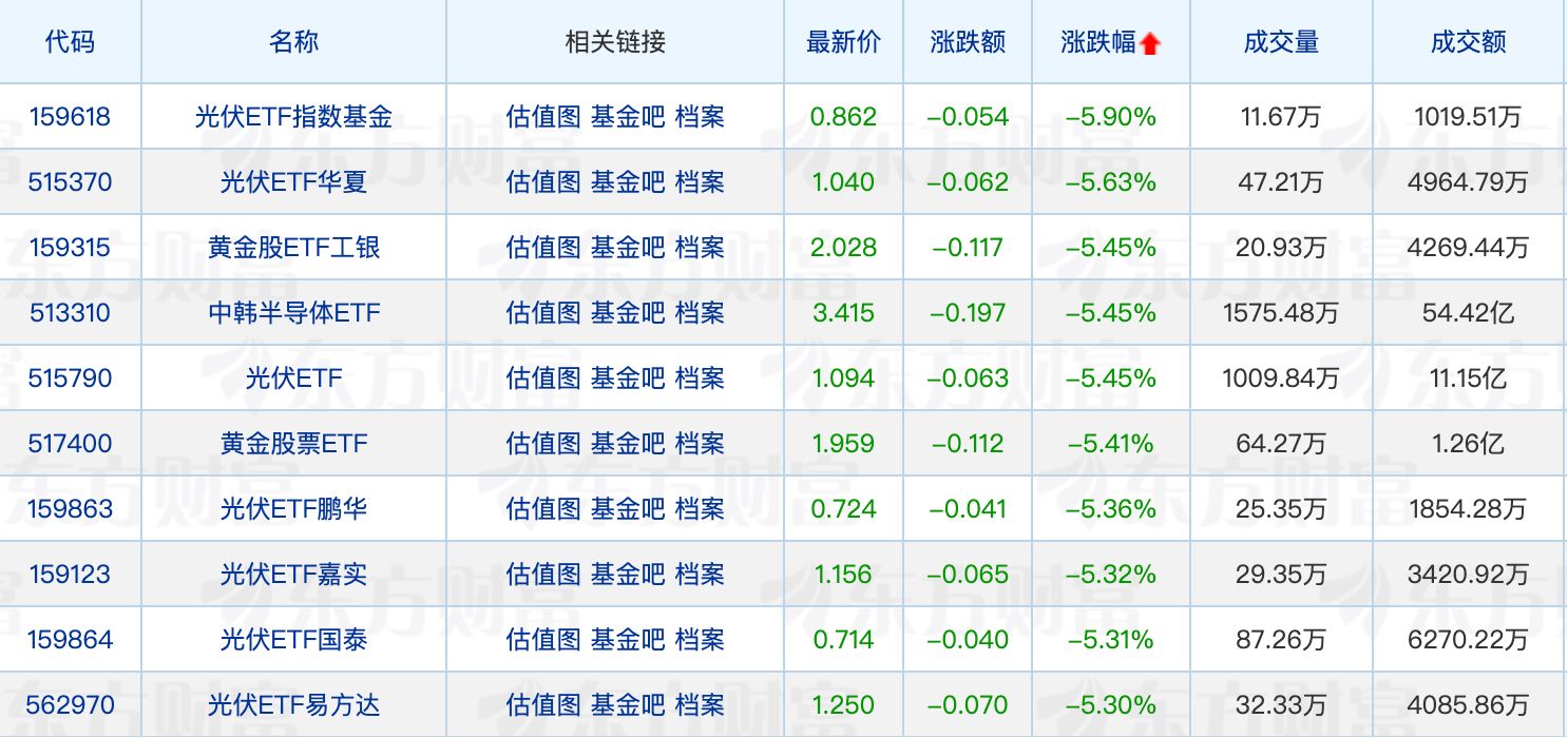 下跌方面,光伏相關(guān)ETF悉數(shù)回調(diào),最大跌幅為5.90%。