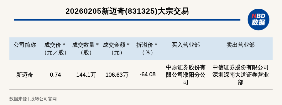 每經(jīng)訊,2026年2月5日,新三板基礎(chǔ)層公司新邁奇(831325,收盤價:2.06元)發(fā)生一筆大宗交易,成交價0.74元/股,成交數(shù)量144.1萬股,成交金額106.63萬元,折價64.08%。買入營業(yè)部是中原證券股份有限公司濮陽分公司,賣出營業(yè)部是中信證券股份有限公司深圳深南大道證券營業(yè)部。