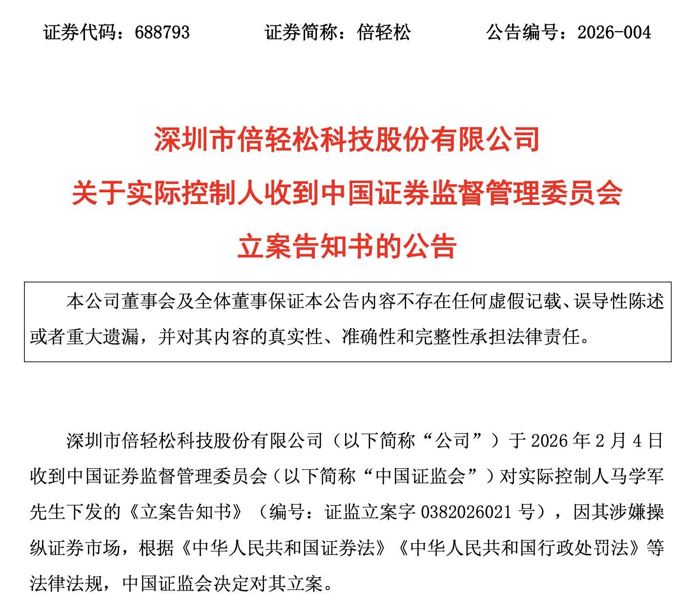 不久前,去年12月25日,倍輕松公告稱,公司及實(shí)際控制人馬學(xué)軍于2025年12月25日收到中國(guó)證監(jiān)會(huì)下發(fā)的《立案告知書》,因涉嫌信息披露違法違規(guī),根據(jù)相關(guān)法律法規(guī),中國(guó)證監(jiān)會(huì)決定對(duì)公司及實(shí)際控制人馬學(xué)軍立案。目前公司經(jīng)營(yíng)活動(dòng)正常,立案調(diào)查期間將積極配合相關(guān)工作并履行信息披露義務(wù)。