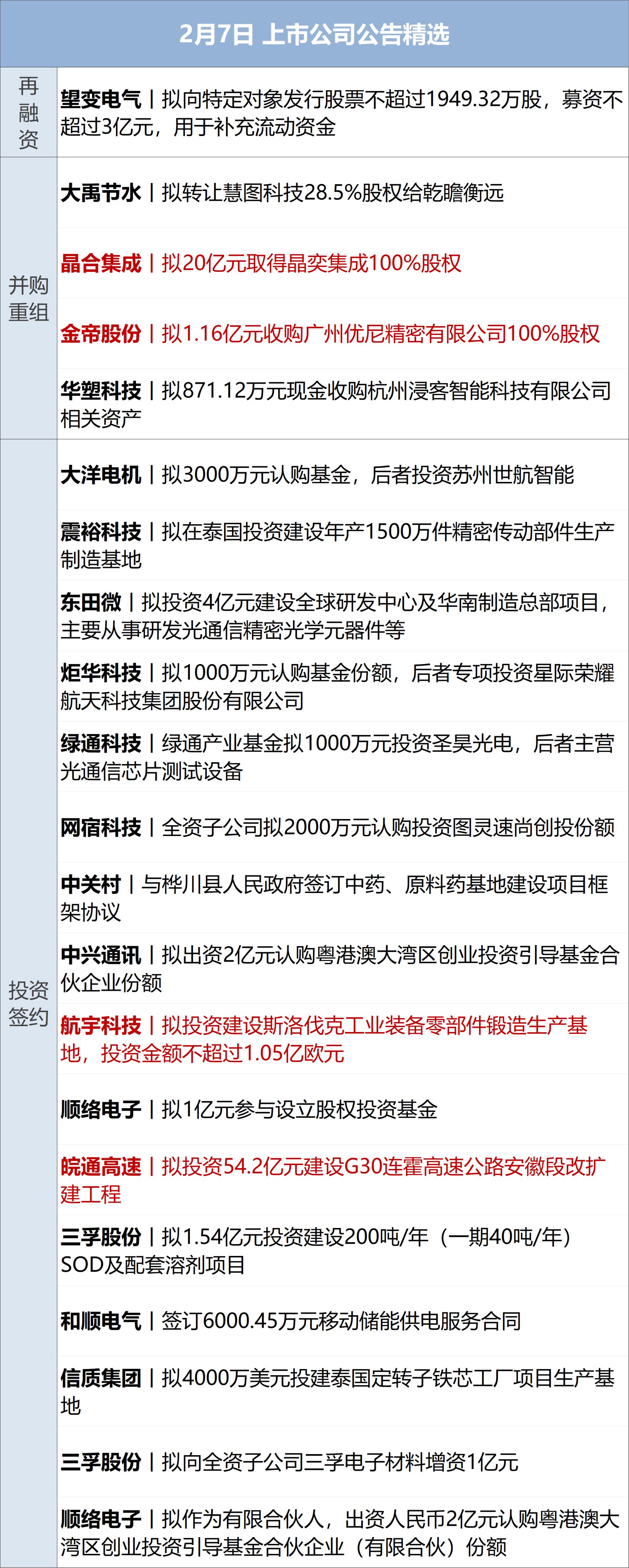 1 李強(qiáng)主持召開國(guó)務(wù)院常務(wù)會(huì)議 國(guó)務(wù)院總理李強(qiáng)2月6日主持召開國(guó)務(wù)院常務(wù)會(huì)議,聽取2025年國(guó)務(wù)院部門辦理全國(guó)人大代表建議和全國(guó)政協(xié)提案工作情況匯報(bào),研究促進(jìn)有效投資政策措施,部署修訂《環(huán)境空氣質(zhì)量標(biāo)準(zhǔn)》,討論《中華人民共和國(guó)招標(biāo)投標(biāo)法(修訂草案)》。(央視新聞) 2 隔夜市場(chǎng) 美股三大指數(shù)集體收漲,道指漲2.47%站上50000點(diǎn)創(chuàng)收盤歷史新高,納指漲2.18%,標(biāo)普500指數(shù)漲1.97%;費(fèi)城半導(dǎo)體指數(shù)大漲5.7%,英偉達(dá)漲近8%,市值增加3250億美元,博通漲超7%,特斯拉漲超3%,亞馬遜跌超5%,谷歌跌超2%。納斯達(dá)克中國(guó)金龍指數(shù)漲3.71%,中概股普漲,蔚來(lái)漲超7%,理想汽車漲超6%,百度漲超5%,小鵬汽車漲近5%,嗶哩嗶哩漲超4%,阿里巴巴、拼多多漲超3%,京東、愛奇藝漲超2%。 國(guó)際油價(jià)集體收漲,美油主力合約漲0.33%,報(bào)63.5美元/桶;布油主力合約漲0.55%,報(bào)67.92美元/桶。 國(guó)際貴金屬普遍收漲,現(xiàn)貨黃金漲3.98%,報(bào)4966.61美元/盎司,COMEX黃金期貨漲2.03%,報(bào)4988.60美元/盎司;現(xiàn)貨白銀漲9.7%,報(bào)77.78美元/盎司;COMEX白銀期貨漲1.06%,報(bào)77.53美元/盎司。 歐洲三大股指收盤全線上漲,德國(guó)DAX指數(shù)漲0.67%報(bào)24654.37點(diǎn),法國(guó)CAC40指數(shù)漲0.43%報(bào)8273.84點(diǎn),英國(guó)富時(shí)100指數(shù)漲0.59%報(bào)10369.75點(diǎn)。 3 外交部:希望立陶宛盡早糾正錯(cuò)誤 回到恪守一個(gè)中國(guó)原則的正確軌道上來(lái) 2月6日,外交部發(fā)言人林劍主持例行記者會(huì)。有記者問(wèn):立陶宛總理表示,立陶宛允許臺(tái)當(dāng)局以“臺(tái)灣”名義在其首都設(shè)立所謂“代表處”,這一行為屬于戰(zhàn)略錯(cuò)誤。請(qǐng)問(wèn)中方是否考慮與立陶宛恢復(fù)全面外交關(guān)系?林劍表示,中方已經(jīng)多次就中立關(guān)系表明立場(chǎng)。中方同立方溝通的大門始終敞開,希望立方將改善雙邊關(guān)系的意愿轉(zhuǎn)化為實(shí)際行動(dòng),盡早糾正錯(cuò)誤,回到恪守一個(gè)中國(guó)原則的正確軌道上來(lái),為中立關(guān)系的正?;e累條件。(央視新聞) 4 中國(guó)人民銀行等八部門發(fā)布關(guān)于進(jìn)一步防范和處置虛擬貨幣等相關(guān)風(fēng)險(xiǎn)的通知 2月6日,中國(guó)人民銀行等八部門發(fā)布關(guān)于進(jìn)一步防范和處置虛擬貨幣等相關(guān)風(fēng)險(xiǎn)的通知。 5 預(yù)制菜將迎首個(gè)國(guó)標(biāo) 2月6日,國(guó)家衛(wèi)生健康委就預(yù)制菜食品安全國(guó)家標(biāo)準(zhǔn)公開征求意見,重點(diǎn)從食品安全和營(yíng)養(yǎng)健康方面對(duì)預(yù)制菜作出規(guī)定,明確預(yù)制菜的定義及其原料、食品添加劑使用、生產(chǎn)過(guò)程、營(yíng)養(yǎng)品質(zhì)、包裝、標(biāo)簽標(biāo)識(shí)、經(jīng)營(yíng)過(guò)程和產(chǎn)品指標(biāo)要求。 6 商務(wù)部:已撥付財(cái)政資金86億元支持消費(fèi)“三新”試點(diǎn)建設(shè) 在2月6日下午召開的國(guó)務(wù)院政策例行吹風(fēng)會(huì)上,商務(wù)部相關(guān)負(fù)責(zé)人表示,已向消費(fèi)新業(yè)態(tài)新模式新場(chǎng)景試點(diǎn)城市撥付首批財(cái)政支持資金86億元,為加快培育服務(wù)消費(fèi)新增長(zhǎng)點(diǎn)注入強(qiáng)勁動(dòng)力。商務(wù)部相關(guān)負(fù)責(zé)人介紹,目前,商務(wù)部、財(cái)政部正在開展消費(fèi)新業(yè)態(tài)新模式新場(chǎng)景試點(diǎn),也就是消費(fèi)“三新”試點(diǎn)建設(shè),多數(shù)服務(wù)消費(fèi)新增長(zhǎng)點(diǎn)領(lǐng)域已經(jīng)納入試點(diǎn)資金支持方向。試點(diǎn)工作突出創(chuàng)新導(dǎo)向,將有效帶動(dòng)社會(huì)資本聚焦新增長(zhǎng)點(diǎn)領(lǐng)域,培育服務(wù)消費(fèi)新場(chǎng)景,增強(qiáng)服務(wù)消費(fèi)發(fā)展動(dòng)能。(央視新聞) 7 警惕不法“代理維權(quán)”短視頻及直播陷阱 多部門發(fā)布風(fēng)險(xiǎn)提示 近期,社會(huì)上一些組織和個(gè)人通過(guò)短視頻及直播等自媒體平臺(tái)違規(guī)制作、散布涉及“全額退?!薄皞鶆?wù)清零”“債務(wù)優(yōu)化”“債務(wù)協(xié)商”“債務(wù)置換”“征信洗白”“投顧退費(fèi)”等不實(shí)短視頻,甚至以直播形式傳授“技巧”,誘導(dǎo)金融消費(fèi)者、投資者委托其“代理維權(quán)”,從而收取高額咨詢費(fèi)、服務(wù)費(fèi),以“依法維權(quán)”之名行“非法牟利”之實(shí)。此類不法“代理維權(quán)”短視頻、直播傳播不實(shí)信息,擾亂金融市場(chǎng)秩序,侵害金融消費(fèi)者、投資者合法權(quán)益。為此,金融監(jiān)管總局、中央網(wǎng)信辦、公安部、中國(guó)人民銀行、中國(guó)證監(jiān)會(huì)發(fā)布風(fēng)險(xiǎn)提示,提醒廣大群眾警惕不法“代理維權(quán)”侵害,依法理性維權(quán)。 8 證監(jiān)會(huì)發(fā)布《關(guān)于境內(nèi)資產(chǎn)境外發(fā)行資產(chǎn)支持證券代幣的監(jiān)管指引》 2月6日,證監(jiān)會(huì)發(fā)布《關(guān)于境內(nèi)資產(chǎn)境外發(fā)行資產(chǎn)支持證券代幣的監(jiān)管指引》。指引所稱境內(nèi)資產(chǎn)境外發(