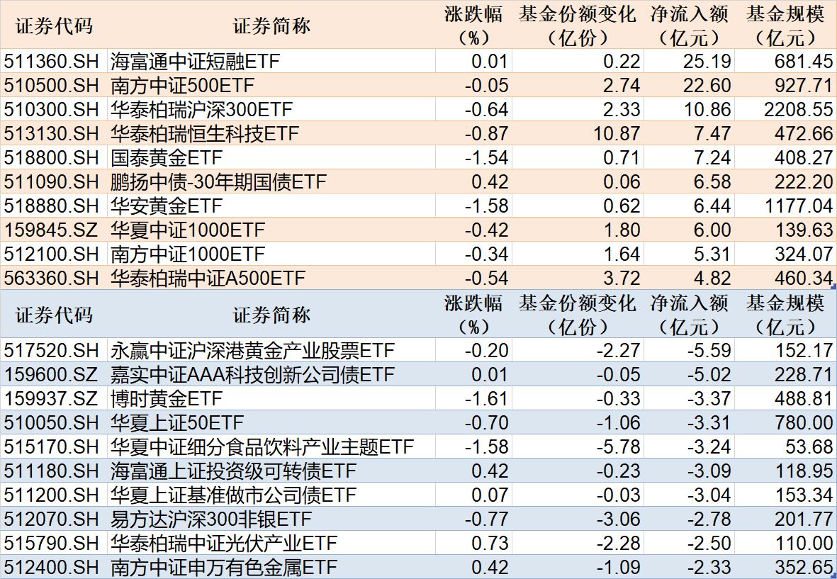 與此同時(shí),永贏中證滬深港黃金產(chǎn)業(yè)股票ETF份額減少 2.27 億份,凈流出額 5.59 億元;嘉實(shí)中證AAA科技創(chuàng)新公司債ETF份額減少 0.05 億份,凈流出額 5.02 億元;博時(shí)黃金ETF份額減少0.33億份,凈流出額 3.37 億元。