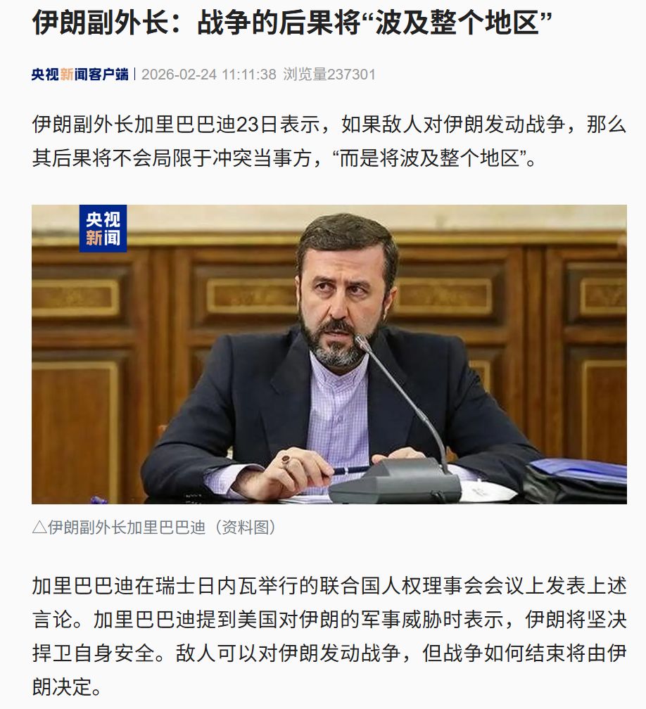 央視新聞報道,伊朗副外長加里巴巴迪23日表示,如果敵人對伊朗發(fā)動戰(zhàn)爭,那么其后果將不會局限于沖突當(dāng)事方,“而是將波及整個地區(qū)”。