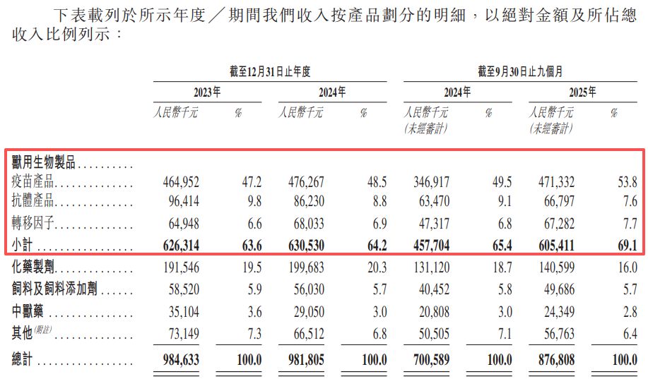 按產(chǎn)品劃分,2023年、2024年和2025年前三季度(以下簡稱“報告期內(nèi)”),信得科技的收入主要來自獸用生物制品(包括疫苗產(chǎn)品、抗體產(chǎn)品和轉(zhuǎn)移因子),收入占比分別為63.6%、64.2%和69.1%。