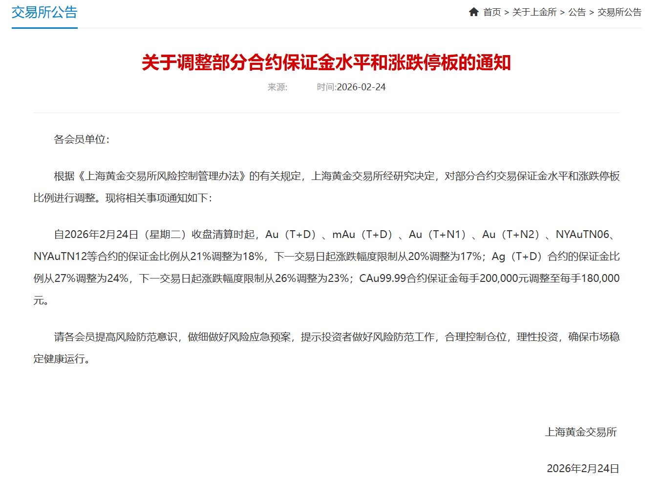 2月24日,上金所發(fā)布通知,調(diào)整部分合約保證金水平和漲跌停板:自2026年2月24日(星期二)收盤(pán)清算時(shí)起,Au(T+D)、mAu(T+D)、Au(T+N1)、Au (T+N2)、NYAuTN06NYAuTN12等合約的保證金比例從21%調(diào)整為18%,下一交易日起漲跌幅度限制從20%調(diào)整為17%;Ag(T+D)合約的保證金比例從27%調(diào)整為24%,下一交易日起漲跌幅度限制從26%調(diào)整為23%;CAu99.99合約保證金每手200,000元調(diào)整至每手180,000元。