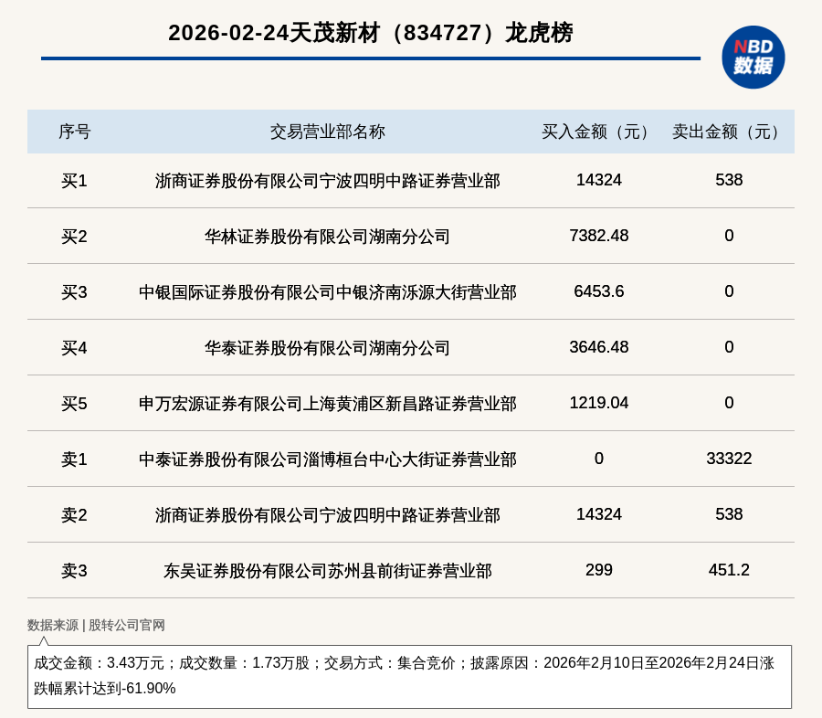 每經(jīng)訊,2026年2月24日,新三板創(chuàng)新層公司天茂新材(834727,收盤價(jià):1.52元)登上龍虎榜,交易方式是集合競(jìng)價(jià),披露原因是2026年2月10日至2026年2月24日漲跌幅累計(jì)達(dá)到-61.90%,成交數(shù)量1.73萬(wàn)股,成交金額3.43萬(wàn)元。買一席位為浙商證券股份有限公司寧波四明中路證券營(yíng)業(yè)部,買入1.43萬(wàn)元;賣一席位為中泰證券股份有限公司淄博桓臺(tái)中心大街證券營(yíng)業(yè)部,賣出3.33萬(wàn)元。