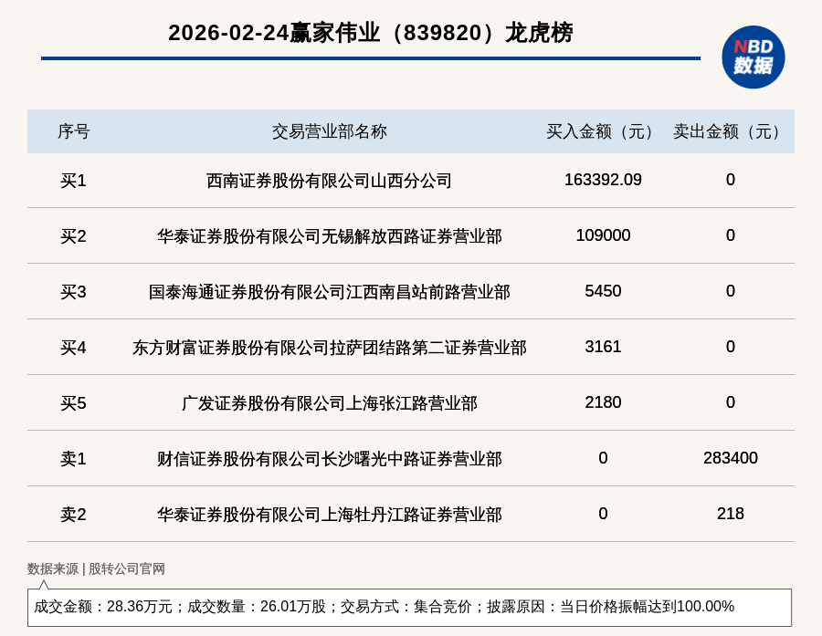 每經(jīng)訊,2026年2月24日,新三板創(chuàng)新層公司贏家偉業(yè)(839820,收盤價(jià):1.09元)登上龍虎榜,交易方式是集合競價(jià),披露原因是當(dāng)日價(jià)格振幅達(dá)到100.00%,成交數(shù)量26.01萬股,成交金額28.36萬元。買一席位為西南證券股份有限公司山西分公司,買入16.34萬元;賣一席位為財(cái)信證券股份有限公司長沙曙光中路證券營業(yè)部,賣出28.34萬元。
