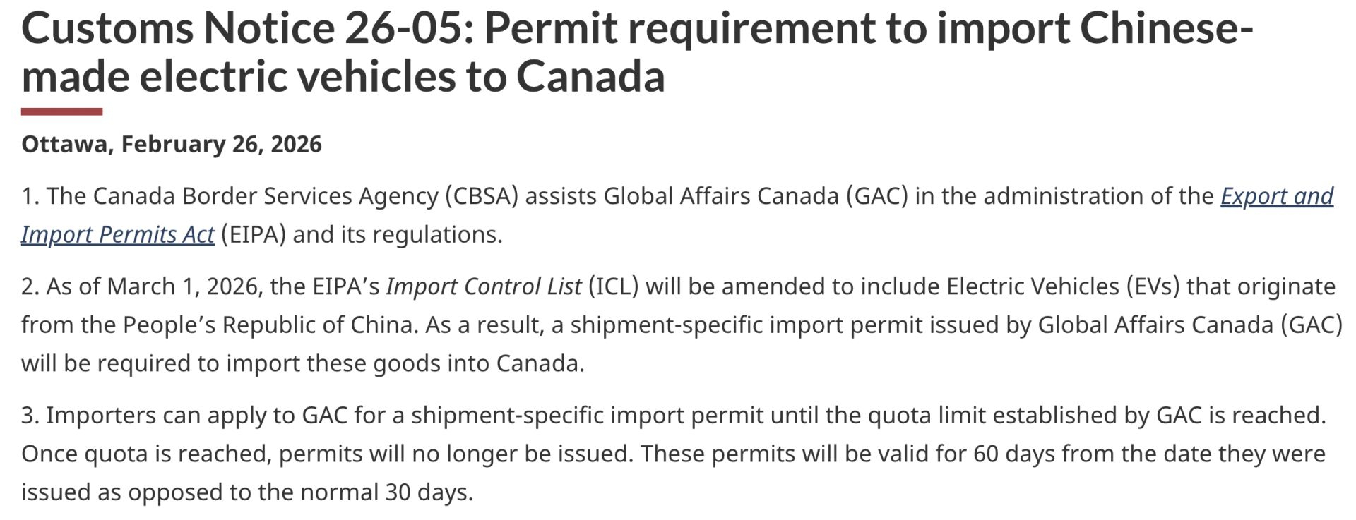 此外,加拿大邊境服務局2月26日發(fā)布的海關通知顯示,所有從中國進口車輛除需獲得進口許可外,還必須符合加拿大全部安全法規(guī)要求。
