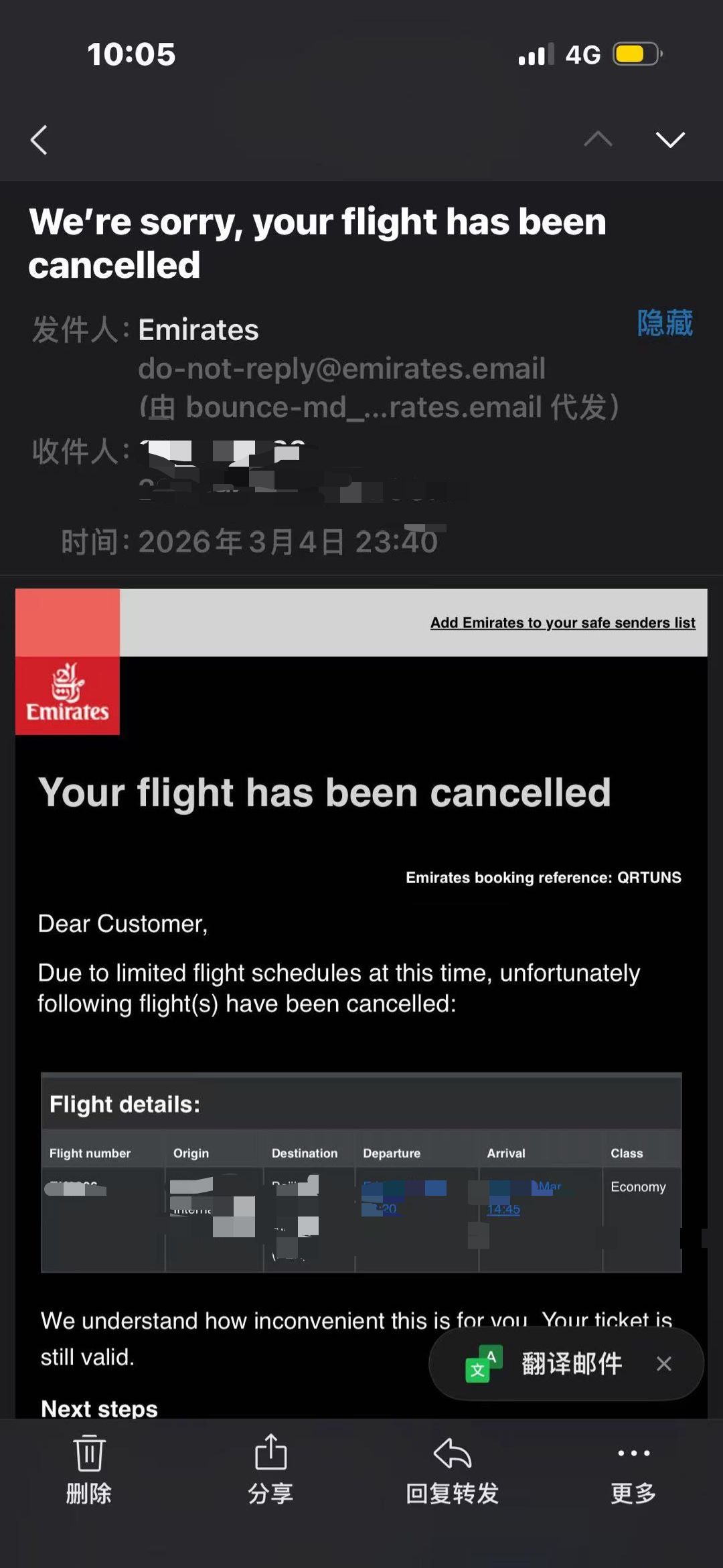 刷了幾個小時手機(jī),在不同購票平臺反復(fù)切換后,林依終于搶到四張從阿曼繞道、經(jīng)達(dá)卡(孟加拉國首都)中轉(zhuǎn)回廣州的機(jī)票——盡管中轉(zhuǎn)要等待十幾個小時,她仍覺得自己是“幸運(yùn)兒”。因?yàn)榫驮?月4日23:40,她收到了原本在出發(fā)前就訂好的3月6日從迪拜返回北京的航班取消通知。
