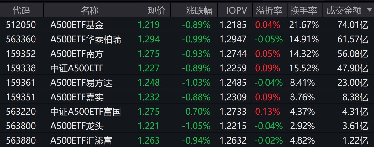 截至上午收盤,場內(nèi)跟蹤中證A500指數(shù)的ETF跌約1%。其中,有9只中證A500相關(guān)ETF成交額超1億元,2只超61億元。A500ETF基金、A500ETF華泰柏瑞早盤成交額分別為74.01億元、61.57億元。