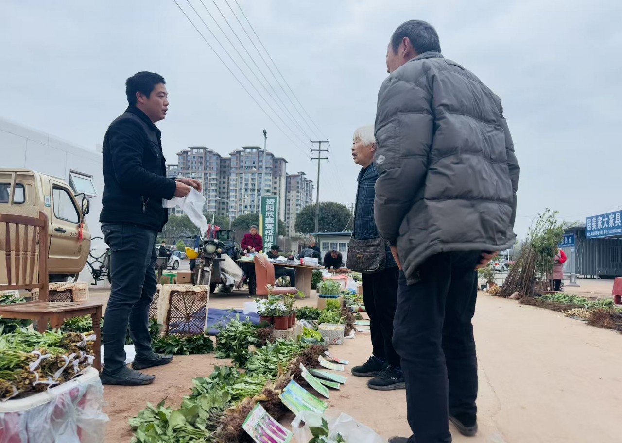 幾十個(gè)攤位次第排開(kāi),竹筐里碼著翠綠的茄苗、辣椒苗,蛇皮袋上擺著一摞摞待售的果樹(shù)苗。買(mǎi)種子的人彎腰細(xì)看,賣(mài)種子的人熱情介紹——這是資陽(yáng)市雁江區(qū)春耕前的“早市”,也是一年農(nóng)事的起點(diǎn)。