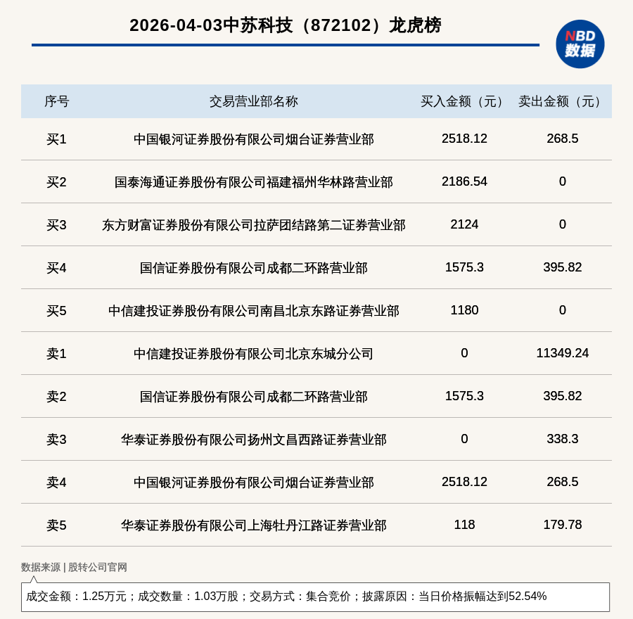 每經(jīng)訊,2026年4月3日,新三板創(chuàng)新層公司中蘇科技(872102,收盤價:1.8元)登上龍虎榜,交易方式是集合競價,披露原因是當(dāng)日價格振幅達到52.54%,成交數(shù)量1.03萬股,成交金額1.25萬元。買一席位為中國銀河證券股份有限公司煙臺證券營業(yè)部,買入2518.12元;賣一席位為中信建投證券股份有限公司北京東城分公司,賣出1.13萬元。