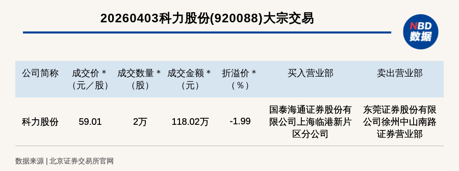 每經(jīng)訊,2026年4月3日,北交所上市公司科力股份(920088,收盤價:60.21元)發(fā)生一筆大宗交易,成交價59.01元/股,成交數(shù)量2萬股,成交金額118.02萬元,折價1.99%。買入營業(yè)部是國泰海通證券股份有限公司上海臨港新片區(qū)分公司,賣出營業(yè)部是東莞證券股份有限公司徐州中山南路證券營業(yè)部。