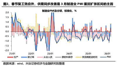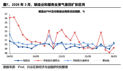 國內(nèi)方面,2026年3月制造業(yè)PMI、非制造業(yè)商務活動指數(shù)均超預期回升并重返擴張區(qū)間,二者分別錄得50.4%、50.1%,較上月分別上升1.4個和0.6個百分點。2026年3月生產(chǎn)指數(shù)和新訂單指數(shù)分別升至51.4%和51.6%,較上月分別提升1.8和3.0個百分點。根據(jù)興業(yè)宏觀的分析,3月制造業(yè)PMI的回升具有顯著的季節(jié)性特征,企業(yè)在春節(jié)假期后通常會加快復工復產(chǎn),帶動市場活躍度反彈。值得關(guān)注的是,今年3月PMI不僅高于榮枯線,也優(yōu)于過去兩年的均值水平,顯示出經(jīng)濟在擺脫年初淡季影響后,具備較強的內(nèi)生修復動能。結(jié)合1-2月實際GDP增速達到5.5%左右的強勁表現(xiàn),3月制造業(yè)PMI的繼續(xù)回升進一步夯實了“十五五”開局有力、起步平穩(wěn)的增長基礎。