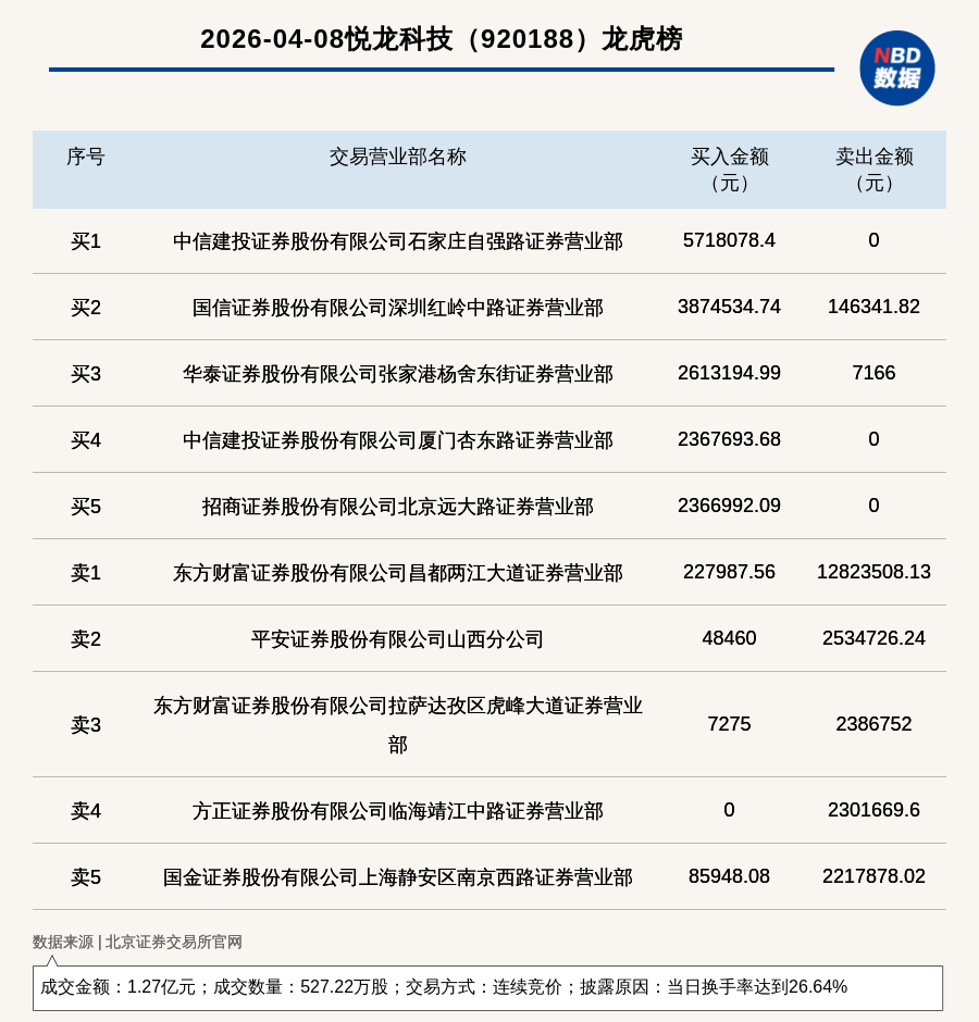 每經(jīng)訊,2026年4月8日,北交所上市公司悅龍科技(920188,收盤價(jià):24.42元)登上龍虎榜,交易方式是連續(xù)競(jìng)價(jià),披露原因是當(dāng)日換手率達(dá)到26.64%,成交數(shù)量527.22萬股,成交金額1.27億元。買一席位為中信建投證券股份有限公司石家莊自強(qiáng)路證券營(yíng)業(yè)部,買入571.81萬元;賣一席位為東方財(cái)富證券股份有限公司昌都兩江大道證券營(yíng)業(yè)部,賣出1282.35萬元。
