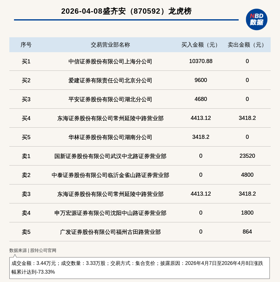 每經(jīng)訊,2026年4月8日,新三板基礎(chǔ)層公司盛齊安(870592,收盤價:0.96元)登上龍虎榜,交易方式是集合競價,披露原因是2026年4月7日至2026年4月8日漲跌幅累計達(dá)到-73.33%,成交數(shù)量3.33萬股,成交金額3.44萬元。買一席位為中信證券股份有限公司上海分公司,買入1.04萬元;賣一席位為國新證券股份有限公司武漢中北路證券營業(yè)部,賣出2.35萬元。