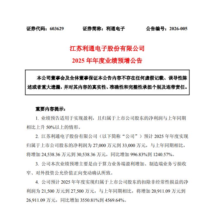 業(yè)績方面,利通電子發(fā)布的2025年年度業(yè)績預(yù)告顯示,公司預(yù)計2025年全年實現(xiàn)歸屬于上市公司股東的凈利潤為2.70億元至3.30億元,同比增長996.83%至1240.57%。對于業(yè)績增長的原因,公司解釋稱,主要是由于算力業(yè)務(wù)端盈利增加、制造端業(yè)務(wù)虧損收窄、對外投資公允價值正向變動確認所致。
