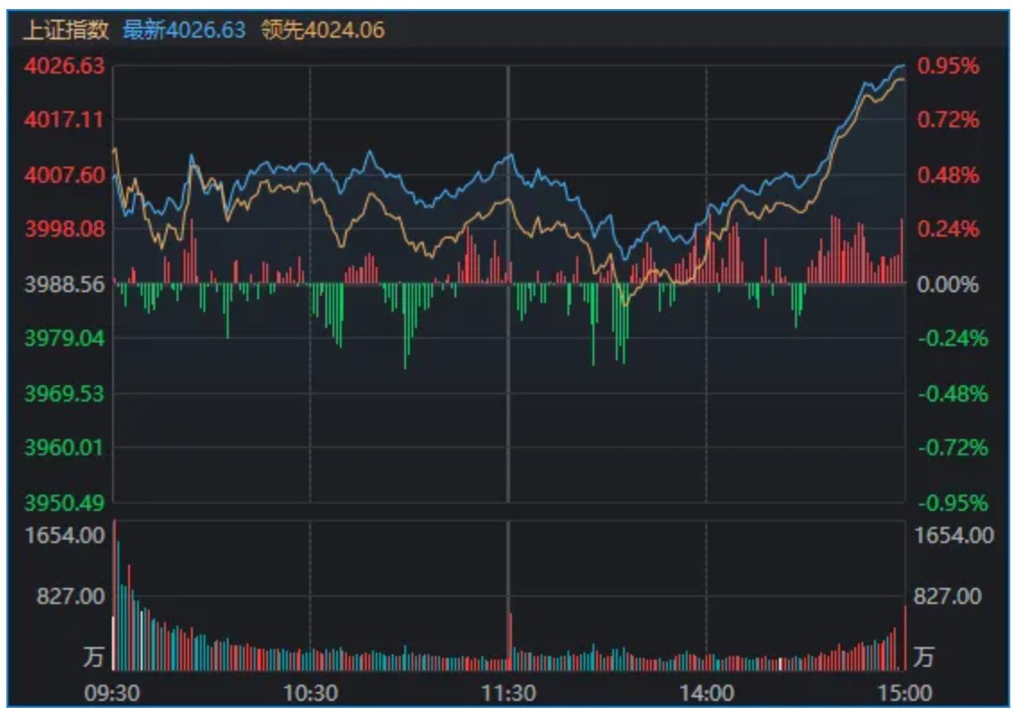 13:00~13:35,全市場(chǎng)出現(xiàn)連續(xù)拋盤,令滬指回落至4000點(diǎn)下方;原本漲超2%的創(chuàng)業(yè)板指,漲幅也縮窄至1%以內(nèi),后漸漸企穩(wěn),尾盤又“V”了回來。