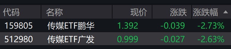 受盤面影響,傳媒相關(guān)ETF跌超2%。