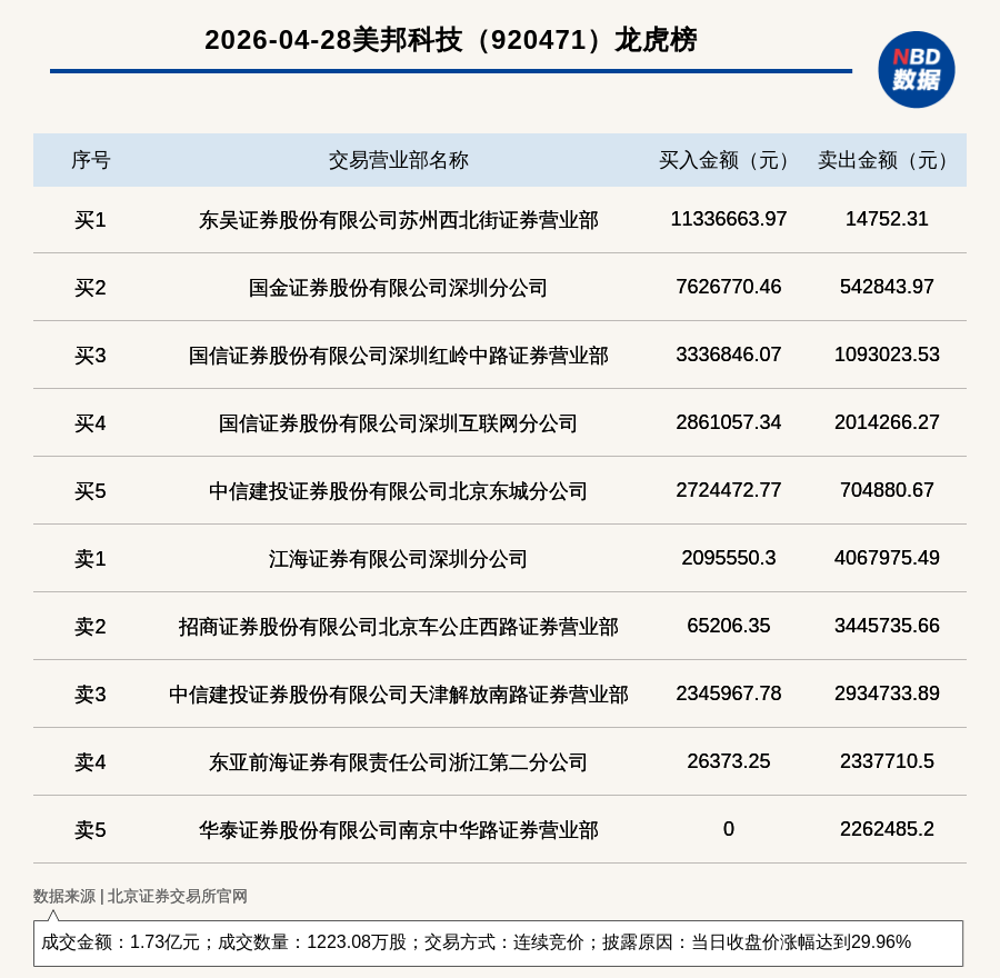 每經(jīng)訊,2026年4月28日,北交所上市公司美邦科技(920471,收盤價(jià):15.53元)登上龍虎榜,交易方式是連續(xù)競價(jià),披露原因是當(dāng)日收盤價(jià)漲幅達(dá)到29.96%,成交數(shù)量1223.08萬股,成交金額1.73億元。買一席位為東吳證券股份有限公司蘇州西北街證券營業(yè)部,買入1133.67萬元;賣一席位為江海證券有限公司深圳分公司,賣出406.8萬元。