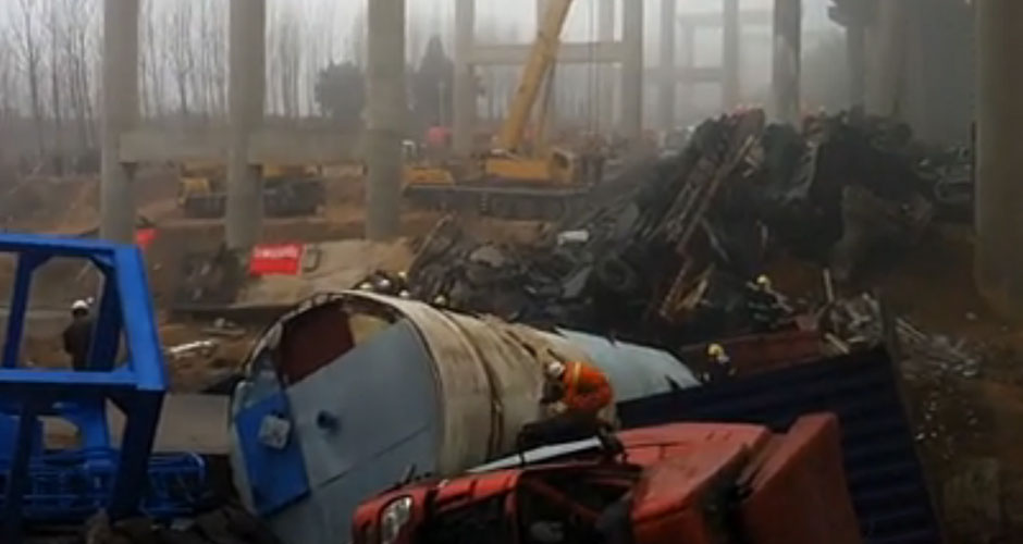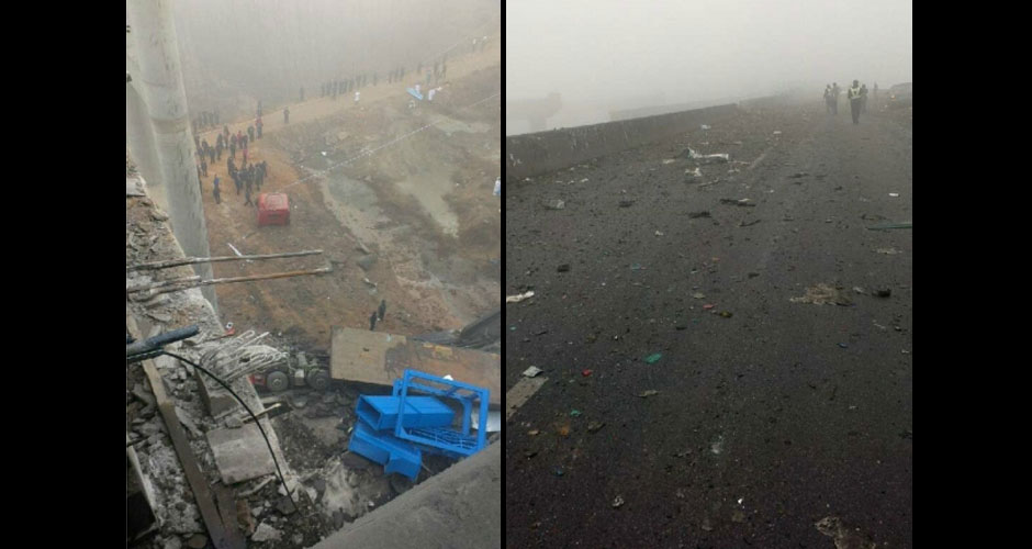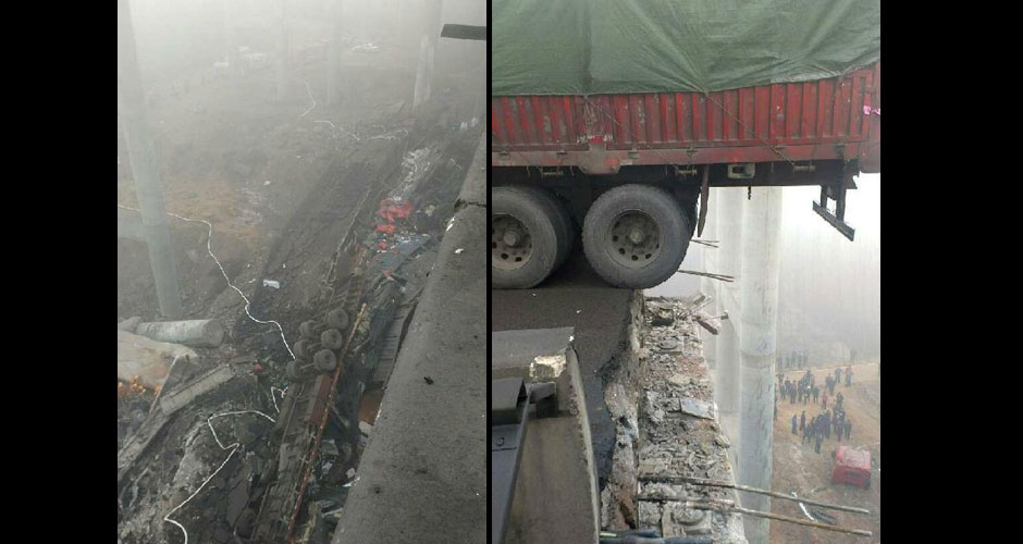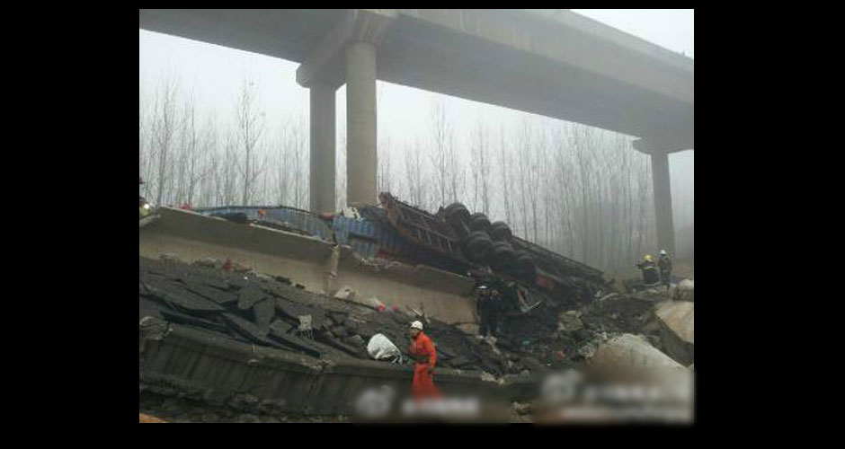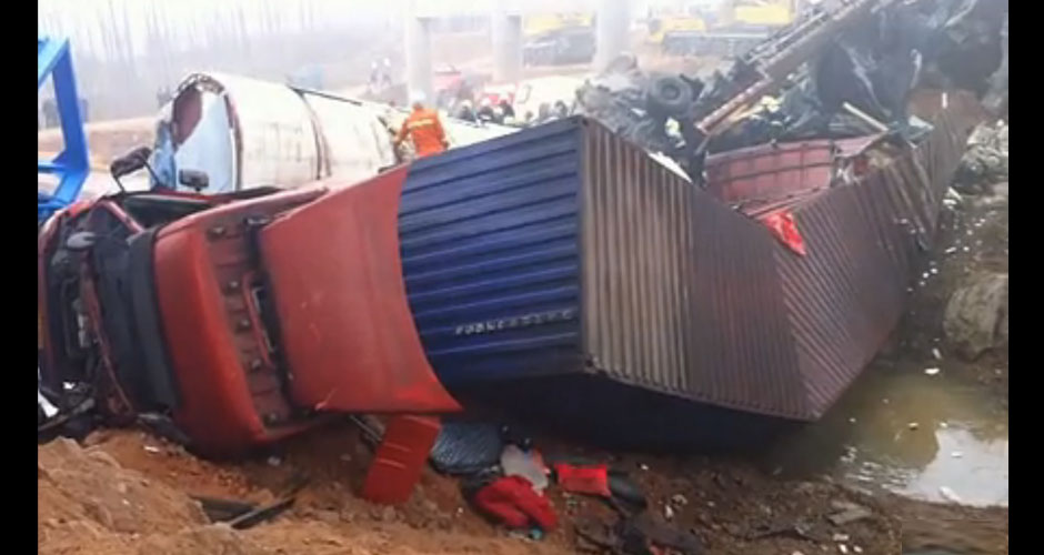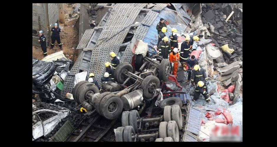 據(jù)有媒體現(xiàn)場報道,看到橋面三大一小四臺貨車掉落地面,兩具遇難者遺體停放在事故貨車邊。數(shù)名傷者已送醫(yī)急救。【查看專題】