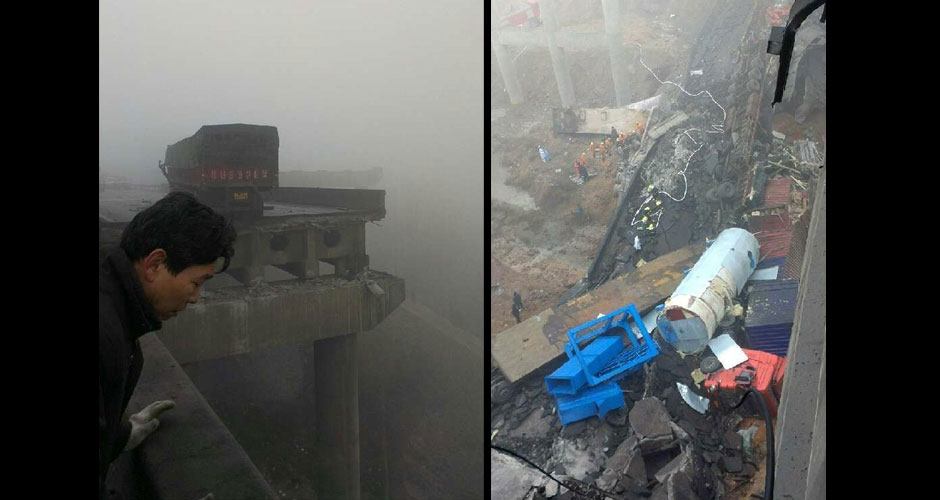 24日5時30左右,哈爾濱機場高速由江南往江北方向,即將進入陽明灘大橋主橋的最后一段被四輛重載貨車壓塌,四輛貨車沖下橋體。據(jù)新華網(wǎng)報道,垮塌事故已造成3人死亡、5人受傷。